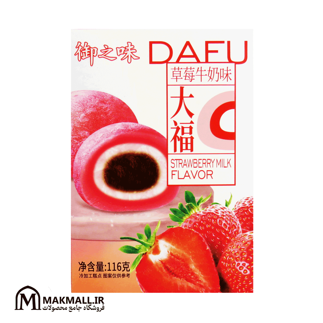 موچی دایفو شیر توتفرنگی از آرد برنج گلوتینوس، شکر، شیر، خامه و عصاره طبیعی توتفرنگی تهیه شده است. توتفرنگیها سرشار از ویتامین C و آنتیاکسیدان هستند که به شادابی پوست و تقویت سیستم ایمنی کمک میکنند. ترکیب شیر و خامه، بافتی مخملی و مزهای متعادل میان شیرینی و ترشی ایجاد میکند.